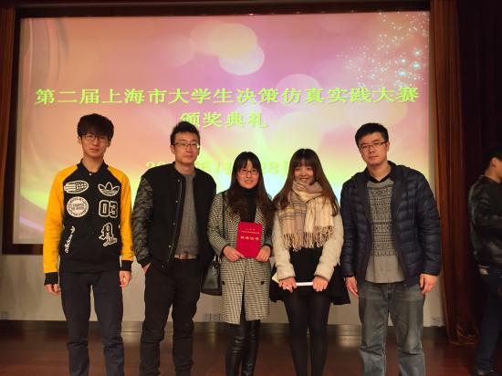 2015年11月28日,由上海市教育委员会主办、东华大学承办的“第二届上海市大学生决策仿真实践大赛”颁奖典礼在东华大学举行,我校工学院计算机专业学生何杰、孙琦茗、明良伟、潘铭檠和陈园园组成的“五个人”团队,喜获二等奖。