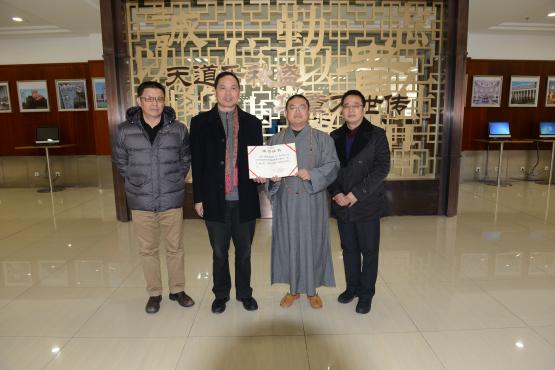 最后,我校领导向法师颁发了捐赠证书,并与法师合影留念,赠书仪式圆满结束。(资产设备处供稿)