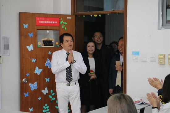 29日早上7:20,赖世雄教授一行早早地来到了日华楼前,他们先后观摩大一学生固定教室早自习和大二年级阶梯教室英语视频学习。在大一年级赖世雄中级美语视频学习教室,赖世雄教授驻足观看,并用英语与同学们进行热烈的互动,赢得了阵阵掌声,随后他观摩了艺术学院和教育学院,特别是在教育学院的英语词汇墙,赖世雄教授给天华学子欣然留下寄语,祝愿同学们一生能够永远喜欢学习英语。