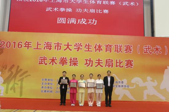 2016年5月21日,上海市大学生体育联赛(武术)武术拳操、功夫扇比赛在上海中医药大学体育馆举行。我校功夫扇队在校领导的关心和支持下,由体育教学部答英娟老师指导并带领参加本次比赛。