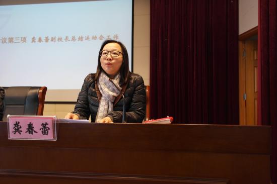 接着,龚春蕾副校长作运动会组织筹备工作总结发言,代表运动会筹备领导小组对全体参赛师生表示了衷心的感谢,指出运动会成功举行是全校师生共同努力的结果。她从领导重视、营造氛围、计划周密、群策群力、赛程精彩等五个方面进行了总结,得出了四点重要启示,一是运动会增强了师生的凝聚力和认同感;二是运动会真切回应了学生对体育赛事的渴望;三是运动会检验了校、院二级工作组织水平;四是在运动会的全过程中守住了安全工作底线;
