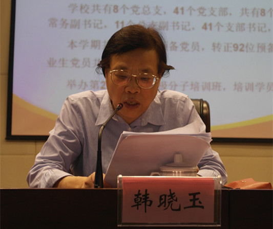 韩晓玉书记从党委分管各项工作的基本情况和本学期党委工作主要特色两个方面对2014-2015学年第二学期党委开展的主要工作进行了总结,并对存在的问题进行了反思,对未来党委工作的开展进行了展望。