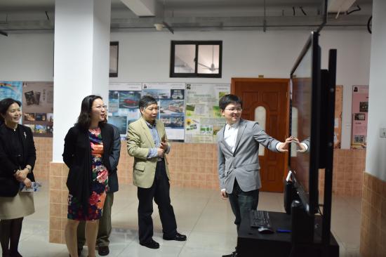 (龚春蕾副校长和来访的第二军医大学教育技术中心张力教授认真观看毕业设计指导老师的演示)