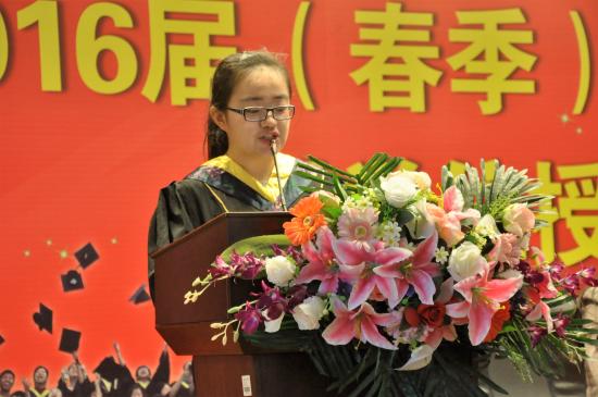 浓浓离别意,深深母校情。优秀毕业生代表张祎同学发言,代表全体毕业生表达了对母校的眷恋与感谢、对老师的感激以及对同学情谊的珍惜之情。国际商务专业指导教授李薇辉老师代表管理学院的全体教师对同学们的毕业表示了衷心的祝贺,也希望全体毕业生在今后的道路上一帆风顺。