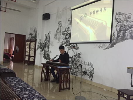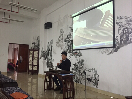 2016年3月8日中午,“古琴学习班”开始第一次古琴课程,周磊老师向大家介绍了古琴在整个中华文化中的独特地位和影响,深入浅出地介绍了古琴的历史文化背景,并向大家教授减字谱、讲解古琴的结构、及“挑”、“勾”二种弹奏指法。大家跃跃欲试,饶有兴趣地不断练习“挑”、“勾”指法。特别是周磊老师现场的精彩演奏,赢得大家阵阵掌声,感受到中国传统文化的古朴典雅的独特魅力。
