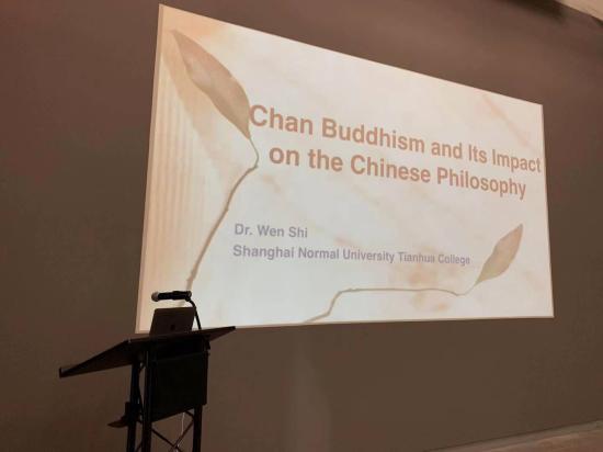 傍晚,史文老师在大学的会议中心做了一场题为“禅宗对中国哲学的影响”的学术报告,到场师生近30余人,包括主管学术的副校长,艺术学院的院长、专业主任等7名教授。在一小时的讲座中,史文老师以清晰的思路和流利准确的英文,从思想史的角度,为听众介绍了中国禅宗的核心思想,及其与传统儒学的激荡、交融,以及如何促进了宋明新儒学的诞生和发展。讲好“中国故事”的同时,也讲了“天华故事”,介绍了天华学院的“经典阅读”项目,以及“四书,六祖坛经”等经典的当代普及情况。特别有意思的是,许多听众对于“六祖慧能”的故事很感兴趣。讲座过后,几位教授饶有兴趣地问了许多问题,并表示很感谢为他们做了中国文化的启蒙。