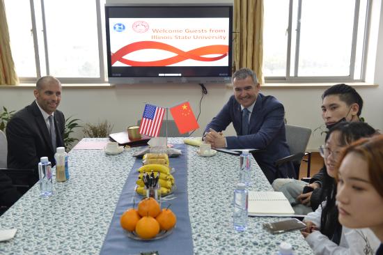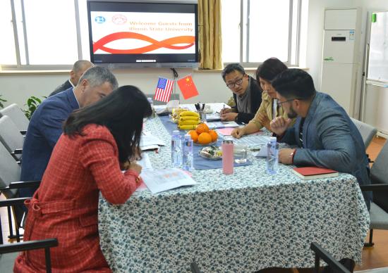 2019年4月4日,美国伊利诺伊州立大学招生办主任Jeff Mavros、艺术系专业主任Michael Wille来访我校。我校校长叶才福、国际交流处处长胡珍、艺术设计学院副院长朱花、国际交流处副处长梁杰、院长助理兼视觉传达设计专业负责人包臻隽、视觉传达设计(双语)专业主任钟华勇热情接待,深入洽谈两校视觉传达设计专业国际合作交流事项及国际课程教学细节。