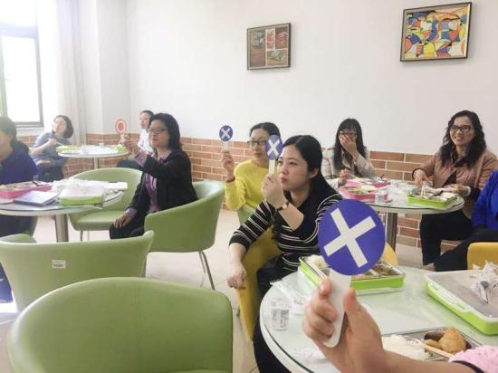 张丽珺博士从社会文化的角度讲解了中日文化的差异,内容主要有三部分:第一部分为日本都道府县概况,简要地介绍了日本各地的分布情况及富士山等一些地标景点的所在地理位置;第二部分为日本社会文化常识,采用智力问答的形式使现场的老师们参与到互动中来,通过图片展示、事例分析,生动地讲解了日本垃圾分类、饮食习惯、交通出行等多方面的文化差异之处;第三部分为日语语言表达,主要讲解了日语语言的文字表达种类,并且当场教授了简单的日常寒暄语,最后带大家一起了解了中日在“数字的手势表达”上的不同之处。