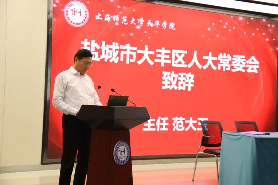 紧接着,由盐城市大丰区人大常委会主任范大玉致辞。范主任首先对我校的校园建设以及学生素质表达高度的赞扬,之后就陆教授能够对盐城市及周边村镇的建设给出的建设性的意见表达了感谢。范主任又简单的向各位介绍盐城市及大丰区优秀的发展状况,相信盐城市在将来一定能够拥有更好的发展。