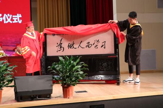 来自工学院的优秀毕业生陆毅豪作为毕业生代表发言。陆毅豪同学从“三抓三坚持”特色学生管理工作总结了大学学习和生活,代表全体毕业生表达了对母校的眷恋、对老师和正副辅导员的感恩、对全校教职工的感谢以及对同学情谊的留恋不舍。随后,陆毅豪同学代表2019届全体毕业生向母校赠送了礼物,一幅双面绣苏绣作品,上面绣有我校校训:为做人而学习。执行董事长代表学校接受了赠礼,同时他十分感谢同学们对母校的感恩之心,他祝愿每一个天华学子都有一个灿烂的前程。