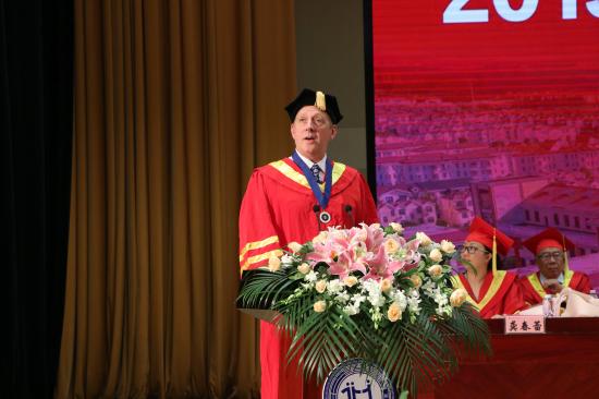 今年是我校迈入教学国际化后,第一批中外合作办学专业学生毕业。经过同学们的努力学习、刻苦钻研,有50名同学取得了双学士学位。本次毕业典礼也诚挚的邀请美方学校代表,西俄勒冈大学副校长Dr. Robert Winningham来到现场并致辞。Dr. Robert Winningham首先向获得双学士学位的50名同学所取得的成绩致敬。他祝愿在场的同学们,带上自己的智慧和勇气,从这里起航,担负起肩上的责任,回报学校、社会和国家。