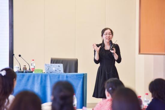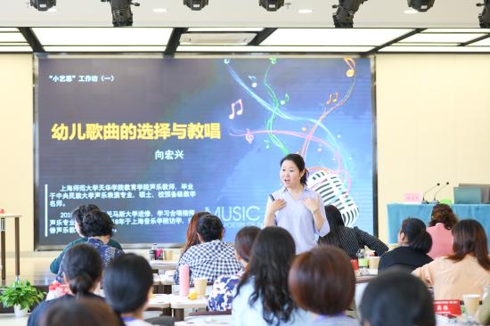 “小艺思”工作坊由学前教育学院向宏兴老师为学员带来《幼儿歌曲的选择与教唱》。向老师以一曲问候歌跟园长们互动认识后,简单直观介绍了3-6岁儿童音乐发展规律和认知特点,介绍了人类歌唱“乐器”的构造。随后,向老师用音乐游戏的方式,少量使用奥尔夫乐器,借助拍手、跺脚、拍腿、振臂等身体律动,同时课程中融入了柯达伊教学法的理念,使用稳定节拍、音阶阶梯、符干记谱法(stick notation)等,带学员体验了节奏、音高,二声部、三声部的变化,随着音乐活动的丰富,最终呈现出一首大家耳熟能详的英文儿童歌曲。整个课程深入浅出,由点到面到体,立体显示了声乐教学的科学性和儿童音乐教学的趣味性。向老师通过精妙的课程设计向研修班的学员们展示了一堂精彩绝伦的工作坊课程。