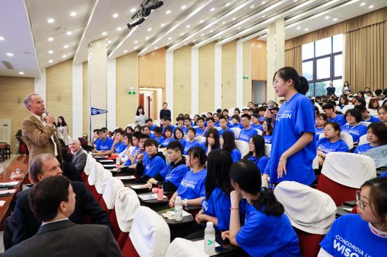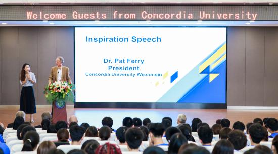 下午,威斯康星协和大学校长一行专程与健康学院康复治疗学(中外合作办学)专业所有学生见面,见面会共分两场,第一场为讲座报告,第二场为2019级新生见面会,由健康学院院长祝亚平主持。第一场主旨报告中,威斯康星分校校长Pat Ferry与在场学生分享了自己23年前来华的经历,感慨中国发展之快、壮大之迅猛,他坚信在经济全球化的大背景下,双方发展联系将更加密切。双方合作不仅仅是中美学生之间的交流,更是两个国家文化的碰撞。他寄语两校的交流学习能将世界隔阂变得更小,让沟通变得更顺畅,助推康复事业的发展。尔湾分校教务长兼执行副校长Peter Senkbeil感慨教育程度的变化、信息技术的提高、分析记录的便捷令教学模式等各方面都得以完善,促进校园国际化发展,鼓励学生掌握共享技能,思考如何在教育的大环境中做出贡献,提升自我。内布拉斯加分校教务长Timothy Preuss以美国健康医疗领域情况为切入点,详细介绍国际生如何顺利申请美国学校等事项,提倡同学们要制定自身学习计划及职业追求,查漏补缺,为将来的深入学习打好坚实基础。