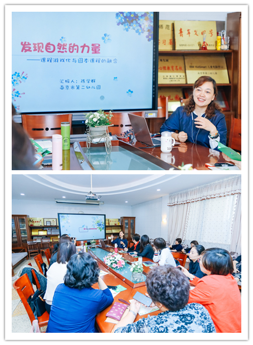 下午十二点半,陈学群园长在温馨的幼儿园接待室,用一个半小时的时间,向研修班的园长学员们作了专题汇报《发现自然的力量——课程游戏化与园本课程的融合》。陈园长介绍了江苏省课程游戏化背景下幼儿园自身的思考与解读,开展了一系列的探索和实践,形成具有园所文化的、健康生态、自然真实的“生命成长启蒙课程”,实现了课程游戏化与园本课程的融合,并用一个视频故事呈现了某中班为期五天的公园探索主题活动,让我们充分感受到二幼的孩子们野外探索学习中生命拔节的声音,看到孩子们不同的学习体验,看到跟随在孩子身后的教师开放、勇敢、自信的教育心态和课程理念引领下的活动策划。随后,二幼的教师郭寒分享了课程故事《团队活动趣事多》,讲述了由孩子发起的“运动会”项目活动,教师如何分析事件、如何给予支持、如何调整做法的思考与实践过程,令我们对教师和幼儿在活动中表现出的生命力、思考力、领悟力而感到赞叹。