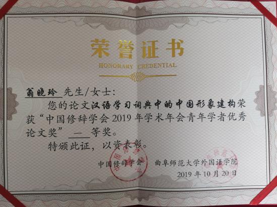 语言文化学院汉语言文学专业主任翁晓玲副教授作为中国修辞学会代表出席了大会,并担任分会场“修辞与话语建构研究”论坛主持人,在会上作题为《汉语学习词典中的中国形象建构》的学术汇报,并在闭幕式上作总结发言。该汇报论文在会上荣获“中国修辞学学会2019年学术年会优秀青年学者论文奖”一等奖。本次大会共评选出优秀青年学者论文奖一等奖6名、二等奖8名。