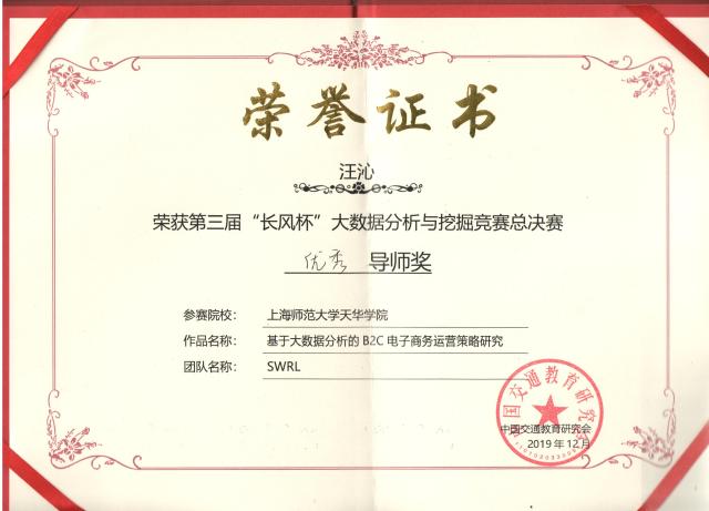 (第三届“长风杯”大数据分析与挖掘竞赛总决赛优秀导师奖汪沁老师荣誉证书)