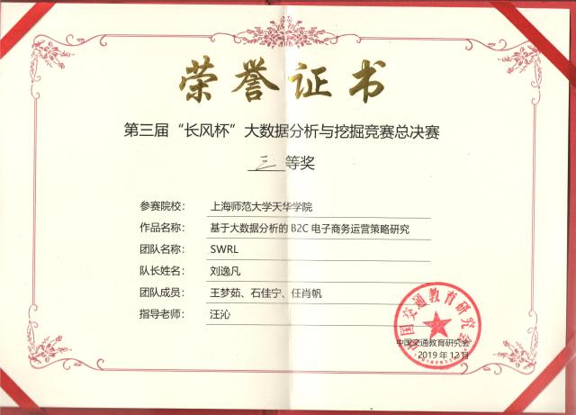 (第三届“长风杯”大数据分析与挖掘竞赛总决赛三等奖荣誉证书)