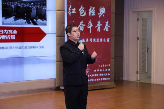 最后,校监、初等教育学院院长史文对本次经典阅读演讲大赛进行了点评,他首先对各二级学院参赛选手的声情并茂地沉浸式演讲给与了充分肯定,同时鼓励同学们回望历史,弘扬红色经典文化,学习革命先烈的精神,将其转化为自己的信仰,为了国家的未来奋力前行。