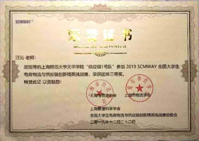 由上海市物流协会和上海市物流学会主办的2019 SCMWAY 全国大学生电商物流与供应链创新精英挑战赛总决赛于2019年12月22日成功举行。商学院物流管理专业郑宁老师指导的SWRL团队和汪沁老师指导的供应链1号队表现优异,荣获团体三等奖。
