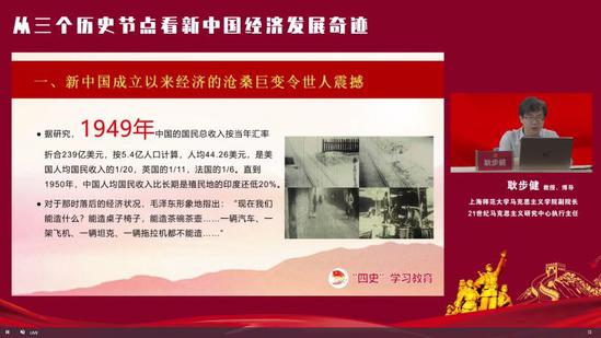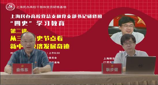 6月19日,上海民办高校党总支书记和党支部书记(委员)研修班开展“四史”学习教育第二次线上学习,邀请老版新葡萄8883国际官网马克思主义学院副院长耿步健教授讲述“新中国史”,作“从三个历史节点看中国经济发展奇迹”精彩报告,老版新葡萄8883国际官网继续教育学院党总支书记、院长俞伟东主持,研修班学员以及民办高校干部、党员、教师、入党积极分子、青年学生5588人实时在线观看视频直播,1008人参与线上互动并为讲座点赞。