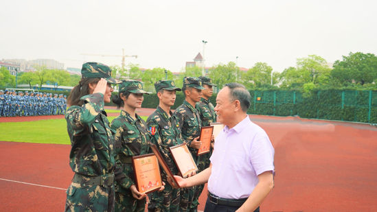 检阅结束后,军训团宣读表彰决定,各学院总支书记为先进连排、军训标兵颁发荣誉证书。