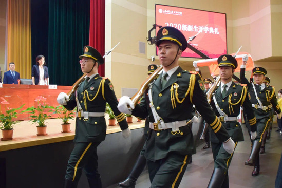 迎国旗、奏唱国歌,交响管乐团演奏的雄壮的国歌声与国旗班铿锵有力的脚步声在大礼堂久久回荡,也深深激荡在每一位2020级新生心里。2020年是不平凡的一年,我们能够如期开学,并不是一件轻而易举的事情,教师代表聂晓晶在发言中与新生们许下两个“一百年”的约定,希望同学们在这四年里坚韧、坚定、坚毅、坚强,积蓄足够的力量,直面历史的坚硬;在品行上正身、正己、正直、正气,正心诚意,律己慎独;在学习上勤恳、勤勉、勤苦、勤奋,勤思善问,博学笃志;在生活上自尊、自信、自强、自爱,自力更生,有耻且格,学出一个广阔的人生,眼界不局限于一隅,此心光明,行者无疆。