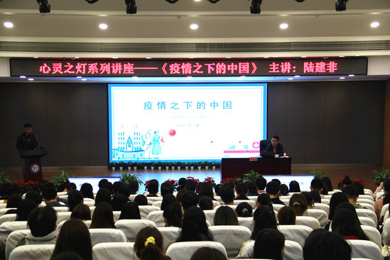 2020年10月28日下午16:15,本学期首期“心灵之灯”系列讲座之《疫情下的中国》在晖华楼报告厅由校党委书记陆建非教授正式开讲。校党委副书记、学保处处长曹云林,学保处助理以上干部,各二级学院党总支书记,全体正副辅导员以及300余名学生聆听了此次讲座。本次讲座由学保处常务副处长包静波主持。