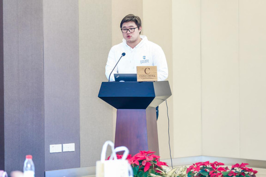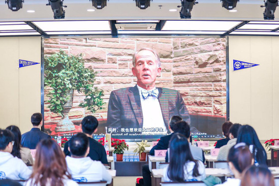 协和大学分管国际项目主任Damian Wyman带来远方协和大学的问候,鼓励新生积极提问,展开互动,利用合作项目的资源优势,期待同学们未来到美丽的协和校园留学。