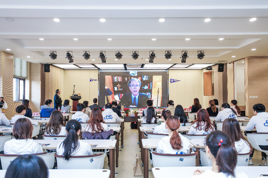 校长叶才福与美方分管国际事务助理副校长Dr. David Birner现场连线,共同为开学典礼致辞。这是双方第十八次见面,尽管受到疫情影响,这次开学典礼采用“线上+线下”的模式,但两校都极其重视相互的合作,提前为开学典礼做了充分准备。双方寄语2020级同学们能在崭新的大学环境中充分体验中美双方带来的优质教学资源及学生支持,践行“专、通、雅”的育人理念。