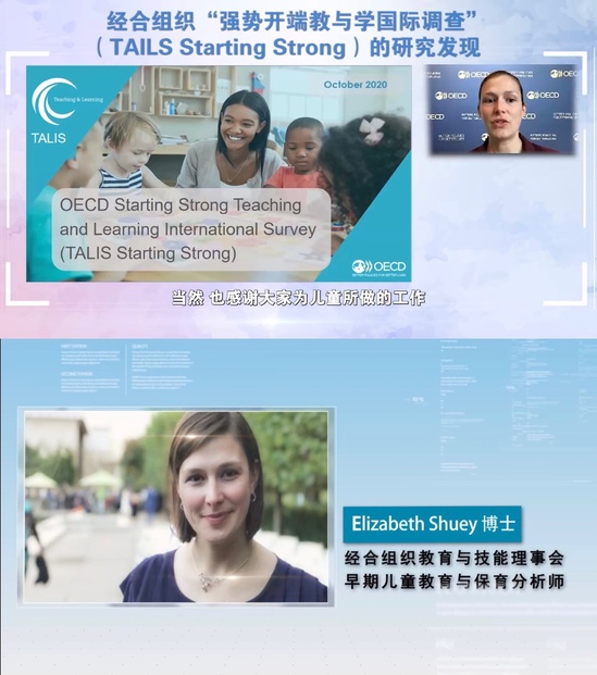 下午,学校还以分会场的形式进行了研修成果交流展示。经合组织教育与技能理事会早期儿童教育与保育分析师Elizabeth Shuey首先作了一个关于强势开端教与学国际调查(即TALIS强势开端)的简短视频介绍,解读了该组织针对幼儿教育和保育领域的教师和园长的国际调查阶段成果。