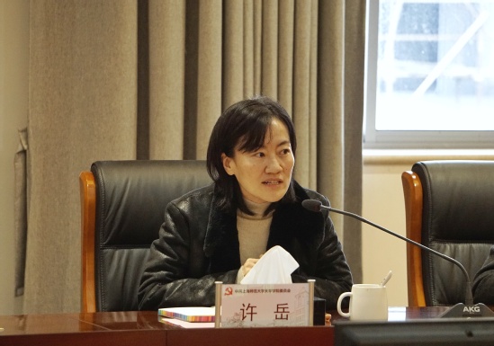 许岳随后通过分享冯友兰的“必有玄心,须有洞见,须有妙赏,必有深情”来交流工作心得。她认为,“必有玄心”是工作时看问题要有高度,个人要有格调。“须有洞见”是做事要有方法,要站在学校的发展、教育事业发展和学生长远发展的角度做事。“须有妙赏”是干工作要有艺术,工作时多一些建设性的语言,多做建设性的事情。“必有深情”是做事不失赤子之心,要在工作时本着最大的善意来爱同事、爱学生。此外,她还谈到“多欲亏义”的典故,让我们保持党的先进性和纯洁性,坚决惩治腐败、纠治不正之风。