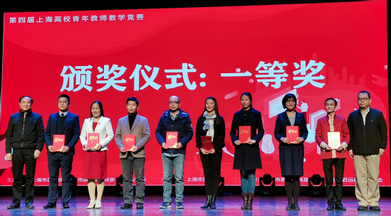 (我校“上海市教学能手”获得者黄毅(右二)上台领取“一等奖”荣誉证书)