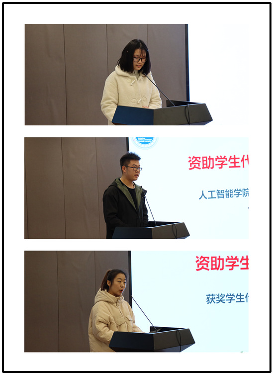 会议第四项议程由来自商学院、人工智能学院的获奖学生代表进行发言。学生们在发言中分享了个人成长经历,感谢来自辅导员的关心和帮助,感谢学校资助工作给予的温暖和感动。作为学生资助先进个人获奖代表,刘俊淑同学倡议同学们要学会感恩,感恩国家和社会的资助,感恩天华学院的教育,应当化感动为力量的源泉,把自己所得到的温暖传递给更多的人。