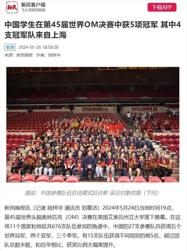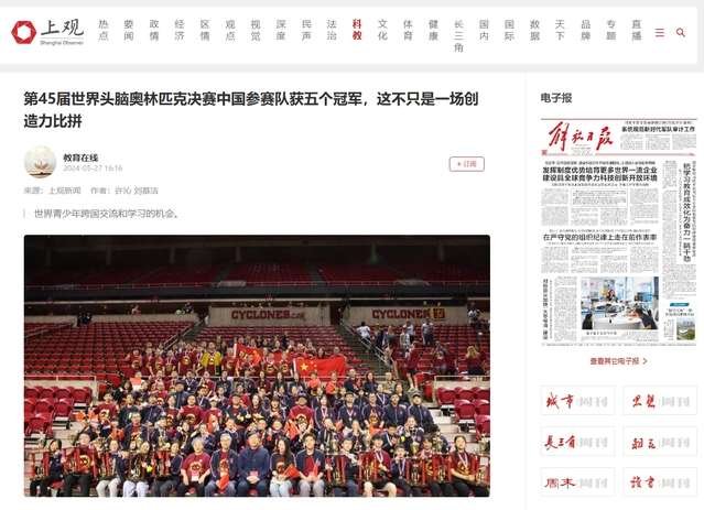 新民晚报 | 中国学生在第45届世界OM决赛中获5项冠军 其中4支冠军队来自上海来源:新民网 2024年5月26日标题:中国学生在第45届世界OM决赛中获5项冠军 其中4支冠军队来自上海作者:陆梓华图说:中国参赛队伍在闭幕式后合影 采访对象供图(下同)新民晚报讯(记者 陆梓华 通讯员 刘慕洁)2024年5月24日当地时间19点,第45届世界头脑奥林匹克(OM)决赛在美国艾奥瓦州立大学落下帷幕。在这场11个国家和地区共676支队伍参加的角逐中,中国的27支参赛队共获得五个世界冠军、两个亚军,三个季军。有15支队伍获得不同组别的前5名,超过团队总数半数,和往年相比,获奖比例大幅度提升。5个冠军中,除了秦皇岛市海港区东港里小学获得“太空深处的结构”小学组冠军外,其余四个均来自上海——上海市向明中学和老版新葡萄8883国际官网分别获得“汽车影院”题目高中组和大学组冠军,上海市大宁国际小学两支参赛队分别获得“人工智能装置”题目和“摇滚穿越之旅”题目小学组冠军。OM大赛是一项培养青少年创造力的活动,学生通过团队合作,创造性地解决问题。一切,都没有标准答案。从情景创设、情节创作到道具制作、技术攻关和表演风格,参赛队员脑洞大开,给出自己的解决方案。图说:大宁国际小学队在比赛中在“太空深2024-05-26 -