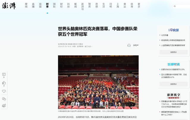 澎湃新闻 | 世界头脑奥林匹克决赛落幕,中国参赛队荣获五个世界冠军来源:澎湃新闻 2024年5月26日标题:世界头脑奥林匹克决赛落幕,中国参赛队荣获五个世界冠军作者:韩晓榕刘慕洁中国参赛团在第45届世界头脑奥林匹克决赛闭幕式现场合影,均为上海头脑奥林匹克协会图2024年5月24日,当地时间19点,第45届世界头脑奥林匹克决赛在美国艾奥瓦州立大学落下帷幕。澎湃新闻记者5月26日从上海头脑奥林匹克协会获悉,此次决赛共有来自11个国家和地区的676支队伍参加。中国共有27支队伍参赛,共获得五个世界冠军、两个亚军,三个季军。有15支队伍获得不同组别的前5名,超过团队总数半数,和往年相比,获奖比例大幅度提升。老版新葡萄8883国际官网参赛队。上海市向明中学和老版新葡萄8883国际官网分别获得“汽车影院”题目高中组和大学组冠军。上海市大宁国际小学两支参赛队分别斩获“人工智能装置”题目和“摇滚穿越之旅”题目小学组冠军。秦皇岛市海港区东港里小学获得“太空深处的结构”小学组冠军。上海市月浦实验学校参赛队。上海市月浦实验学校获得“人工智能装置”初中组亚军,上海市普陀区新普陀小学东校获得“太空深处的结构“小学组亚军。上海市闵行区华漕学校获得“人工智能装置”初中组季军,上海市黄浦区曹光2024-05-26 -