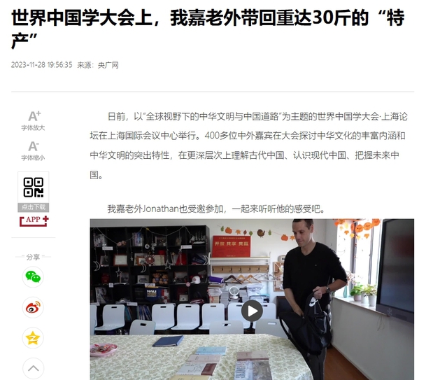 央广网 | 世界中国学大会上,我嘉老外带回重达30斤的“特产”来源:央广网 2023年11月28日标题:世界中国学大会上,我嘉老外带回重达30斤的“特产”作者:彭晓妍日前,以“全球视野下的中华文明与中国道路”为主题的世界中国学大会·上海论坛在上海国际会议中心举行。400多位中外嘉宾在大会探讨中华文化的丰富内涵和中华文明的突出特性,在更深层次上理解古代中国、认识现代中国、把握未来中国。“大会气氛很open,会议记录有收获”Jonathan是来自老版新葡萄8883国际官网的一名加拿大籍外教,主要负责教授学术英语和英美文学导论等课程。此次受邀参加2023世界中国学大会,Johnathan感到十分开心:“整个大会的气氛,一如上海这座城市带给我的感受一样,海纳百川。”“150多个国家、30多个国际组织签署共建‘一带一路’合作文件,中国如何把‘朋友圈’越做越大?中国式现代化的途径和模式是什么?”来自各国的专家学者,就“全球视野下的中华文明与中国道路”这一主题开展交流讨论,不论国家、语言,与会人员尽情抒发着自己对“中国式现代化”“中国文学”“中国历史”的观点,交流学术成果。论坛上,专家们带来自己的议题与观点。论坛下,Johnathan一边聆听,一边在大会目录上记下随2023-11-28