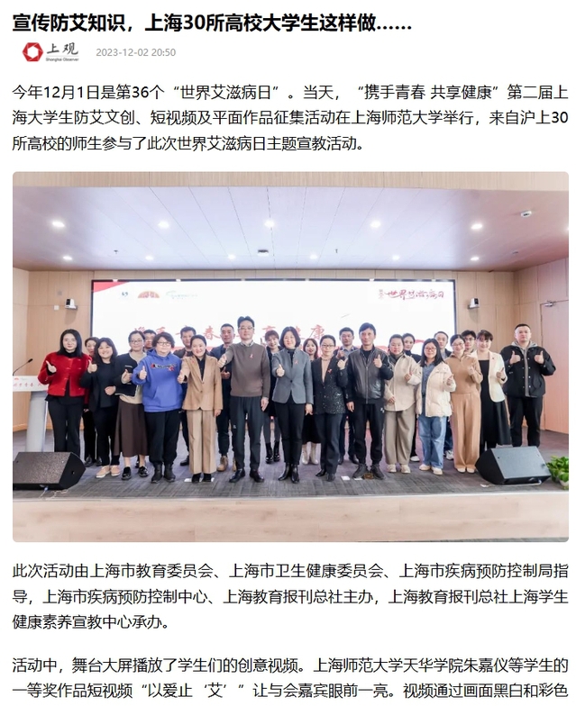上观新闻 | 宣传防艾知识,上海30所高校大学生这样做……来源:上观新闻 2023年12月2日标题:宣传防艾知识,上海30所高校大学生这样做……作者:第一教育今年12月1日是第36个“世界艾滋病日”。当天,“携手青春 共享健康”第二届上海大学生防艾文创、短视频及平面作品征集活动在老版新葡萄8883国际官网举行,来自沪上30所高校的师生参与了此次世界艾滋病日主题宣教活动。与会嘉宾与获奖学生合影此次活动由上海市教育委员会、上海市卫生健康委员会、上海市疾病预防控制局指导,上海市疾病预防控制中心、上海教育报刊总社主办,上海教育报刊总社上海学生健康素养宣教中心承办。活动中,舞台大屏播放了学生们的创意视频。老版新葡萄8883国际官网朱嘉仪等学生的一等奖作品短视频“以爱止‘艾’”让与会嘉宾眼前一亮。视频通过画面黑白和彩色的色调切换,用形象的方式讲解了艾滋病的传播途径和常见误解,最后用充满温情的画面提出“伸出温暖的手,感动冷漠的心”的防歧视主题。朱嘉仪介绍,为了拍摄这则短片,团队对许多真实案例进行了了解,认识到艾滋病给患者及家庭带来的痛苦,越发感到防艾反歧视宣教的重要性。30所高校学生参与此次活动上海南湖职业技术学院张逸婷的海报《拥抱爱,推开艾》和老版新葡萄8883国际官网“《For You2023-12-02 -
