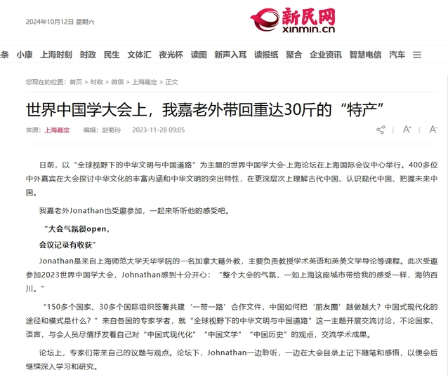 新民网 | 世界中国学大会上,我嘉老外带回重达30斤的“特产”来源:上观新闻 2023年11月28日标题:世界中国学大会上,我嘉老外带回重达30斤的“特产”作者:彭晓妍日前,以“全球视野下的中华文明与中国道路”为主题的世界中国学大会·上海论坛在上海国际会议中心举行。400多位中外嘉宾在大会探讨中华文化的丰富内涵和中华文明的突出特性,在更深层次上理解古代中国、认识现代中国、把握未来中国。我嘉老外Jonathan也受邀参加,一起来听听他的感受吧。“大会气氛很open,会议记录有收获”Jonathan是来自老版新葡萄8883国际官网的一名加拿大籍外教,主要负责教授学术英语和英美文学导论等课程。此次受邀参加2023世界中国学大会,Johnathan感到十分开心:“整个大会的气氛,一如上海这座城市带给我的感受一样,海纳百川。”“150多个国家、30多个国际组织签署共建‘一带一路’合作文件,中国如何把‘朋友圈’越做越大?中国式现代化的途径和模式是什么?”来自各国的专家学者,就“全球视野下的中华文明与中国道路”这一主题开展交流讨论,不论国家、语言,与会人员尽情抒发着自己对“中国式现代化”“中国文学”“中国历史”的观点,交流学术成果。论坛上,专家们带来自己的议题与观点2023-11-28 -