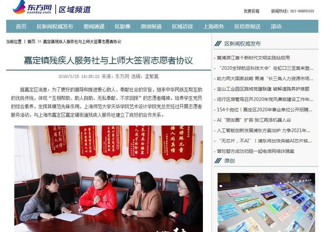 东方网:嘉定镇残疾人服务社与上师大天华学院签署志愿者协议新闻链接:http://city.eastday.com/gk/20190325/u1ai12361436.html2019-03-26 -