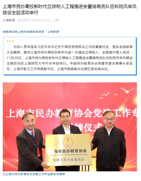 上海教育 | 上海市民办高校新时代立德树人工程推进会暨辅导员队伍和班风学风建设主题活动举行来源:上海教育 2024年11月20日标题:上海市民办高校新时代立德树人工程推进会暨辅导员队伍和班风学风建设主题活动举行记者:陆沈毓为深入贯彻落实习近平总书记关于高校思想政治工作的重要论述,落实全国教育大会精神,推动上海市民办高校在新时代进一步强化立德树人、全面提升育人成效,11月20日,上海市民办高校新时代立德树人工程推进会暨辅导员队伍和班风学风建设主题活动在老版新葡萄8883国际官网举行。中国民办教育协会党建专委会理事长俞亚东,上海市教卫工作党委副书记、上海市教委副主任顾红亮出席会议。会上举行了“上海市民办教育协会党建工作专业委员会”揭牌仪式,俞亚东、顾红亮为专委会揭牌。该专委会旨在进一步聚焦民办高校党建和思政工作,依托一批资深专家,通过研制工作标准、开展评估督导、举办专业培训、提供专业意见等,为民办高校党建和思政工作精准“把脉”,“一校一策”提供个性化、定制化解决方案,从而推动上海民办高校党建和思政工作更高质量发展。顾红亮指出,全市民办高校要按照“教育强国建设规划纲要”和“时代新人铸魂工程”任务要求,着力构建完善学校立德树人工作领导体系、推进体系、责任体系和评价体系,深化“三全育人”,2024-11-20 -
