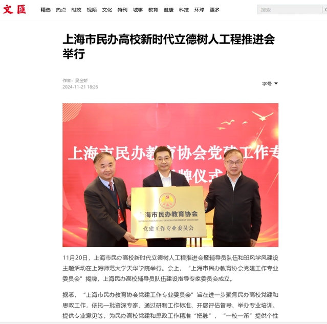 东方教育时报 | 如何推进“新时代立德树人工程”?上海民办高校推进会这样做来源:东方教育时报 2024年11月21日标题:如何推进“新时代立德树人工程”?上海民办高校推进会这样做记者:徐瑶君“来来来,我们4个建个群,以后多联系勤交流啊……”在上海民办高校辅导员队伍建设指导专家委员会成立之时,记者捕捉到了这样温馨的一幕:一位民办高校老书记以带教“师傅”的身份热情地号召3位“徒弟”一起建微信群。中国民办教育协会党建专委会理事长俞亚东指出:“日常思政教育是一种教学相长,需要教师与学生进行深度交流、相互促进,抓好辅导员队伍建设,调动学生主动参与,正是促进教学相长的重要方法。”为深入贯彻落实习近平总书记关于高校思想政治工作的重要论述,落实全国教育大会精神,11月20日,上海民办高校“新时代立德树人工程”推进会暨辅导员队伍和班风学风建设主题活动在老版新葡萄8883国际官网举行。会上为“上海市民办教育协会党建工作专业委员会”揭牌,成立了上海民办高校辅导员队伍建设指导专家委员会,并开展了专家与青年辅导员结对带教仪式。何为“上海市民办教育协会党建工作专业委员会”?记者了解到,该专委会旨在进一步聚焦民办高校党建和思政工作,依托一批资深专家,通过研制工作标准、开展评估督导、举办专业培训2024-11-21 -