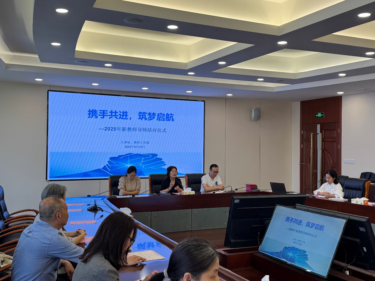 携手共进,筑梦启航——我校隆重举行2025年新教师导师结对仪式为助力新教师快速融入学校环境、提升教育教学能力,充分发挥骨干教师的“传、帮、带”作用,9月19日中午,“携手共进,筑梦启航——2025年新教师导师结对仪式”在明华楼五楼会议中心隆重举行。校长助理、人事处处长、教师工作部部长滕薇,教务处处长、数智处处长徐振,教师工作部常务副部长、人事处副处长王茜,各二级学院教学院长、受聘导师及全体新教师共同出席了仪式。仪式由教师工作部副部长李艳艳主持。滕薇处长首先详细解读了本次新教师培训的总体方案设计。她强调,学校高度重视教师队伍特别是新教师的培养与发展,本次系统化、个性化的培训方案旨在为新教师的职业起步奠定坚实基础,助力其快速完成角色转变,成长为符合学校发展要求的高素质专业化教师。(校长助理、人事处处长、教师工作部部长滕薇老师发言)教师工作部常务副部长、人事处副处长王茜就新教师常态化培训的具体内容进行了介绍。她表示,培训将贯穿整个学年,涵盖师德师风、教学规范、科研入门、信息技术应用等多个模块,通过系列讲座、工作坊、教学观摩等形式,持续为新教师成长提供支持与养分。(教师工作部常务副部长、人事处副处长王茜老师发言)人事处、教务处领导为受聘导师们逐一颁发聘书2025-09-22 -